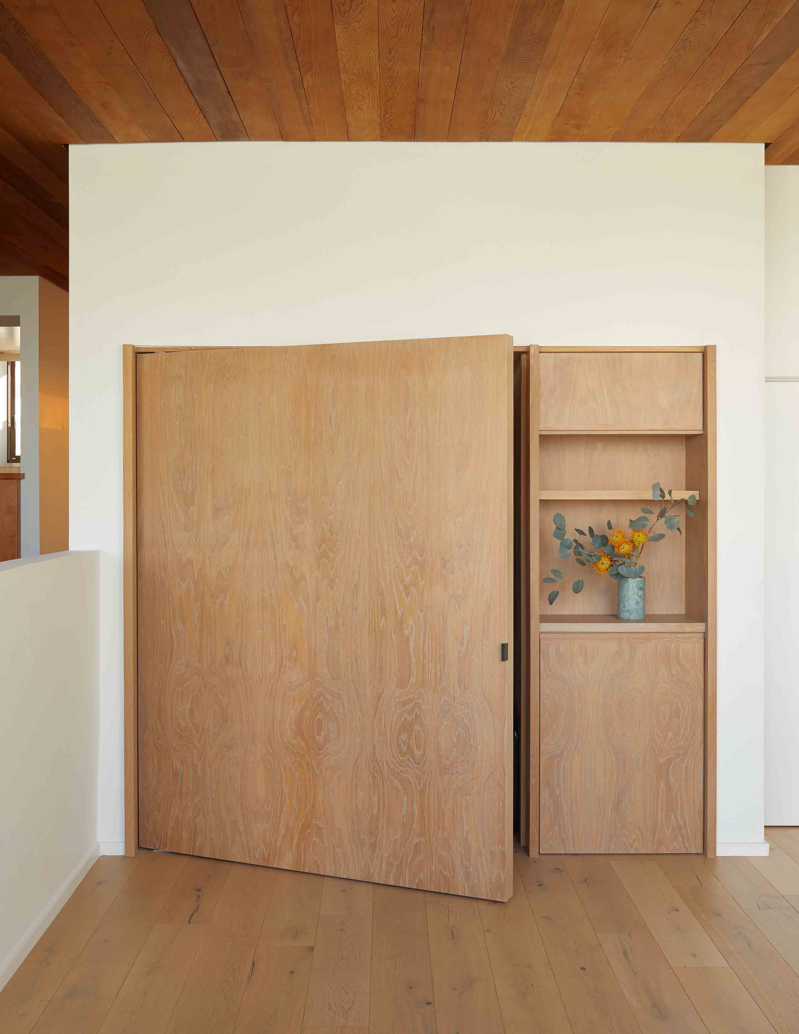 Natürlich fügen sich solche Techniken auch perfekt in ein herkömmliches Zuhause ein. Nabi Boyd hat eine „Pivot Tür“ mit einem FritsJurgens System One pivot Scharnier gestaltet. Die Tür, genauer gesagt die Schranktür, wurde von MANEUVERWORKS gebaut. Dahinter befindet sich ein Ausziehbett.