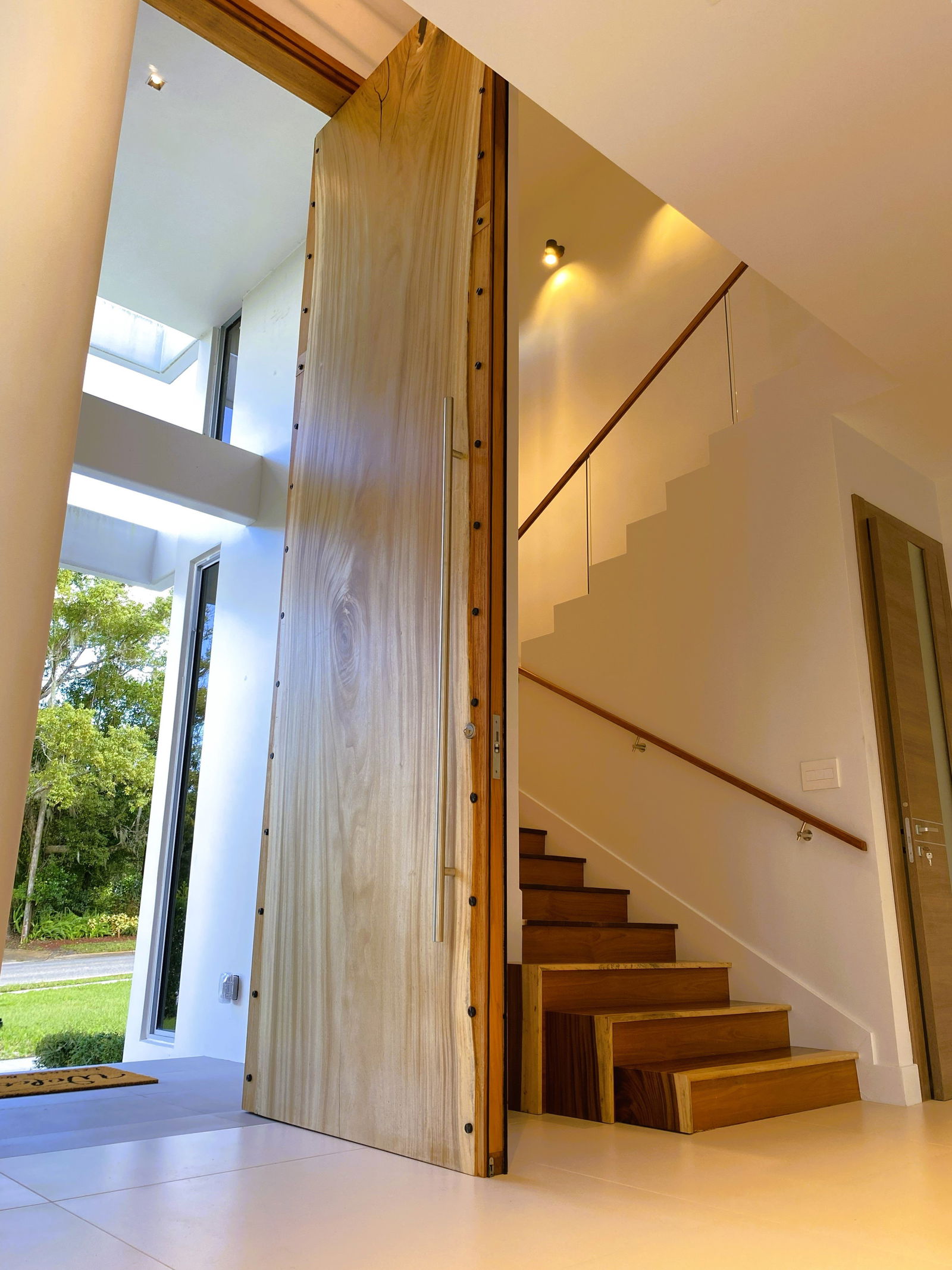 Des forêts du Costa Rica à un atelier de Floride, cette porte pivotante en bois de Parota (Guanacaste) incarne la patience, la précision et le respect des matériaux. Les panneaux séchés au soleil ont été appariés et collés à une âme en nid d'abeille d'aluminium, préservant ainsi la beauté naturelle du bois massif tout en assurant une stabilité structurelle durable.