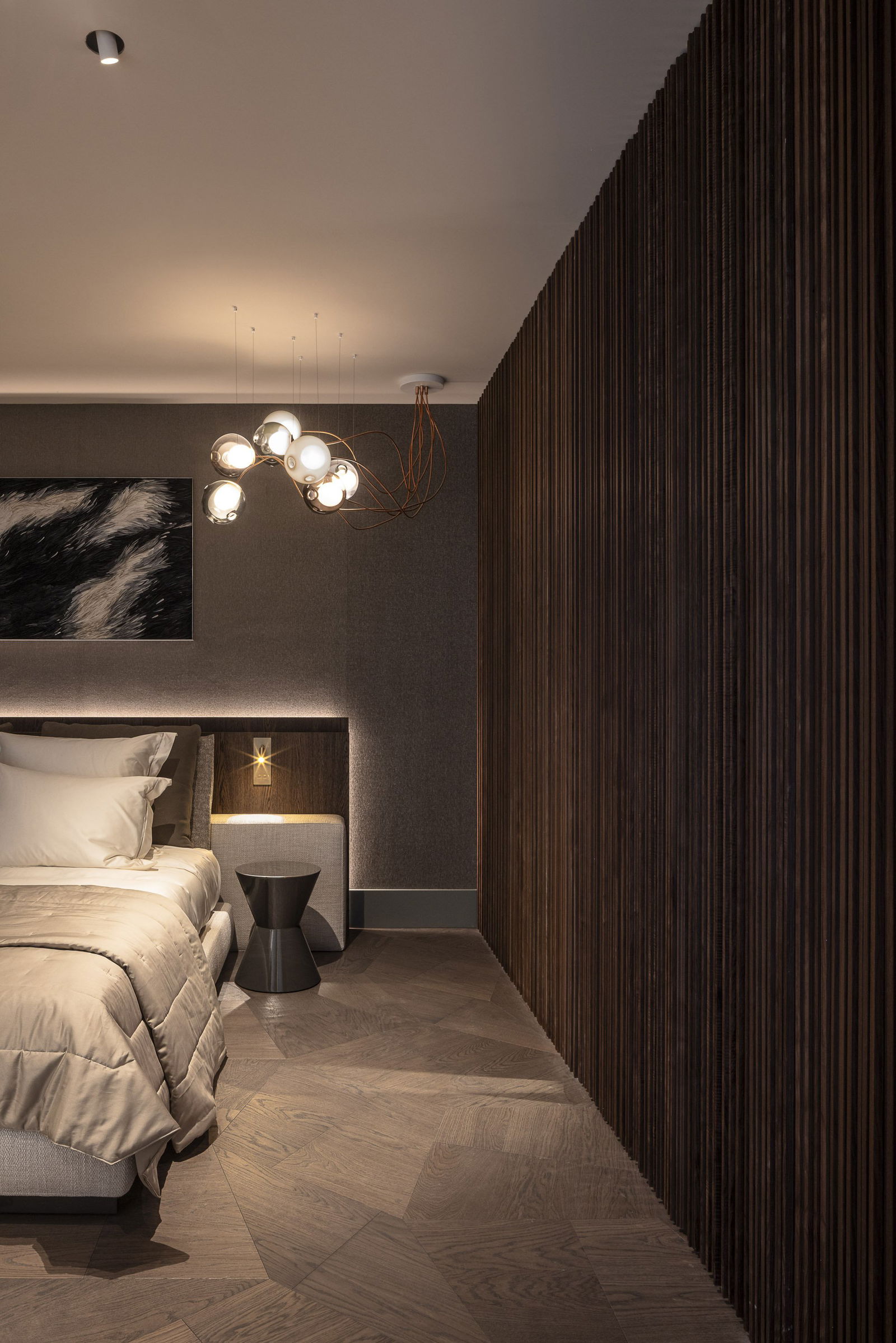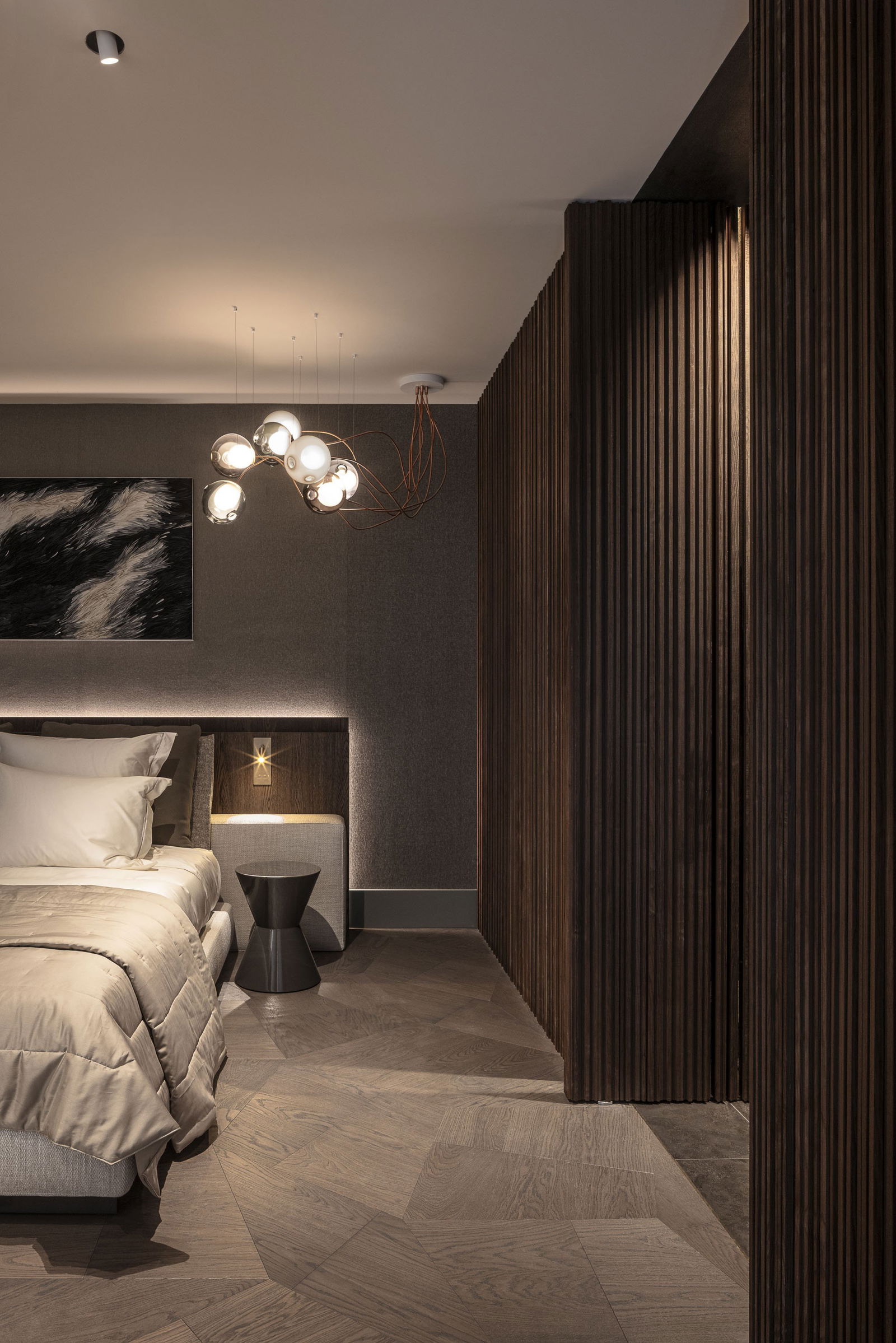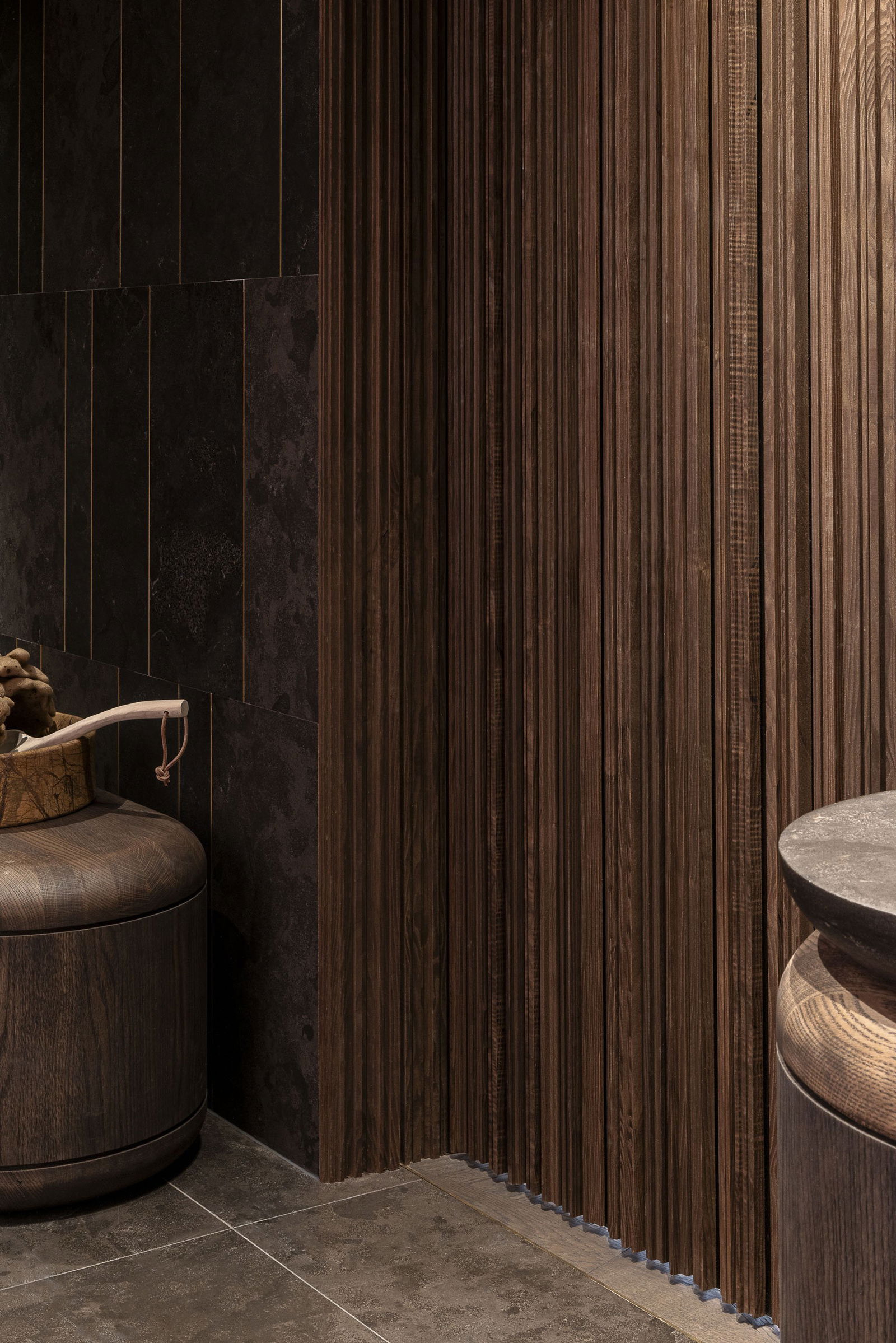 Dans cette résidence de Rotterdam, la raffinement des matériaux rencontre l'intégration parfaite. La porte pivotante disparaît harmonieusement dans un mur de lattes de bois verticales, créant une surface apaisante et unifiée. Ouverte, elle révèle un doux contraste, des textures chaleureuses, de la pierre naturelle et un éclairage subtil qui accentuent la profondeur spatiale.