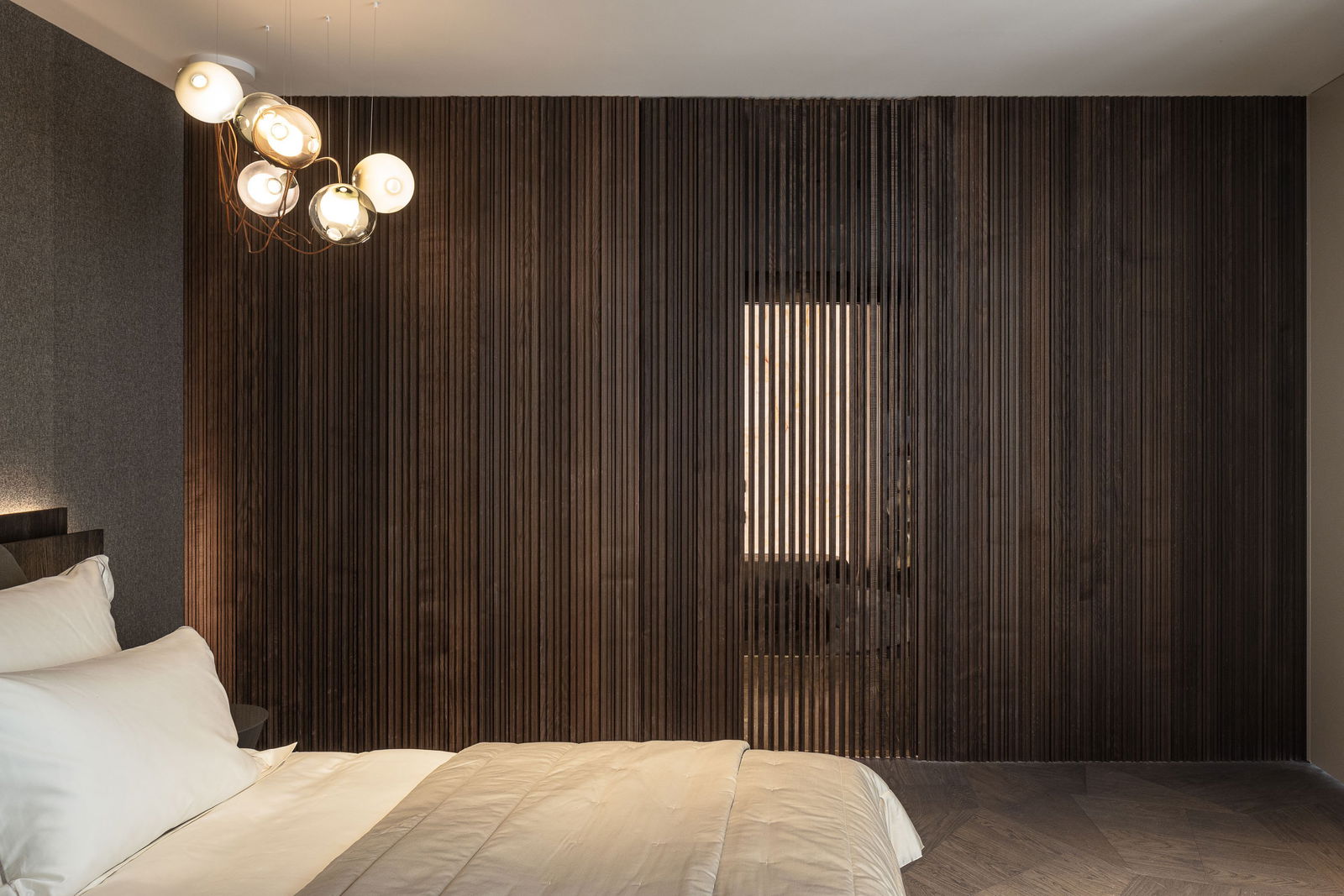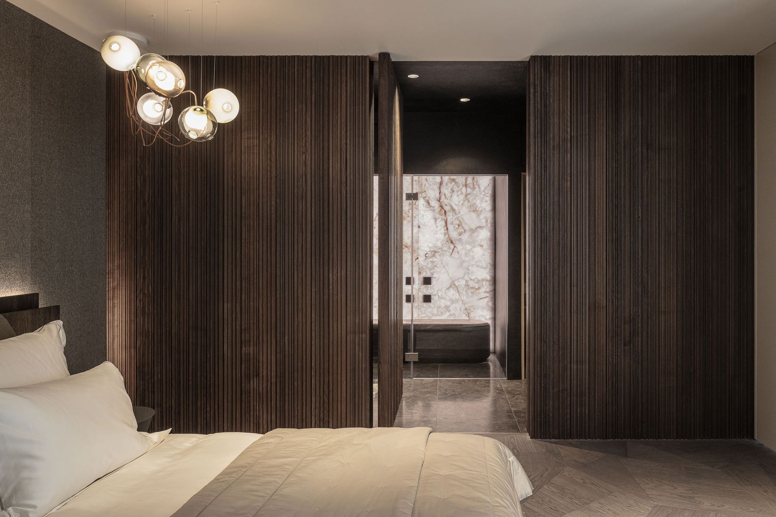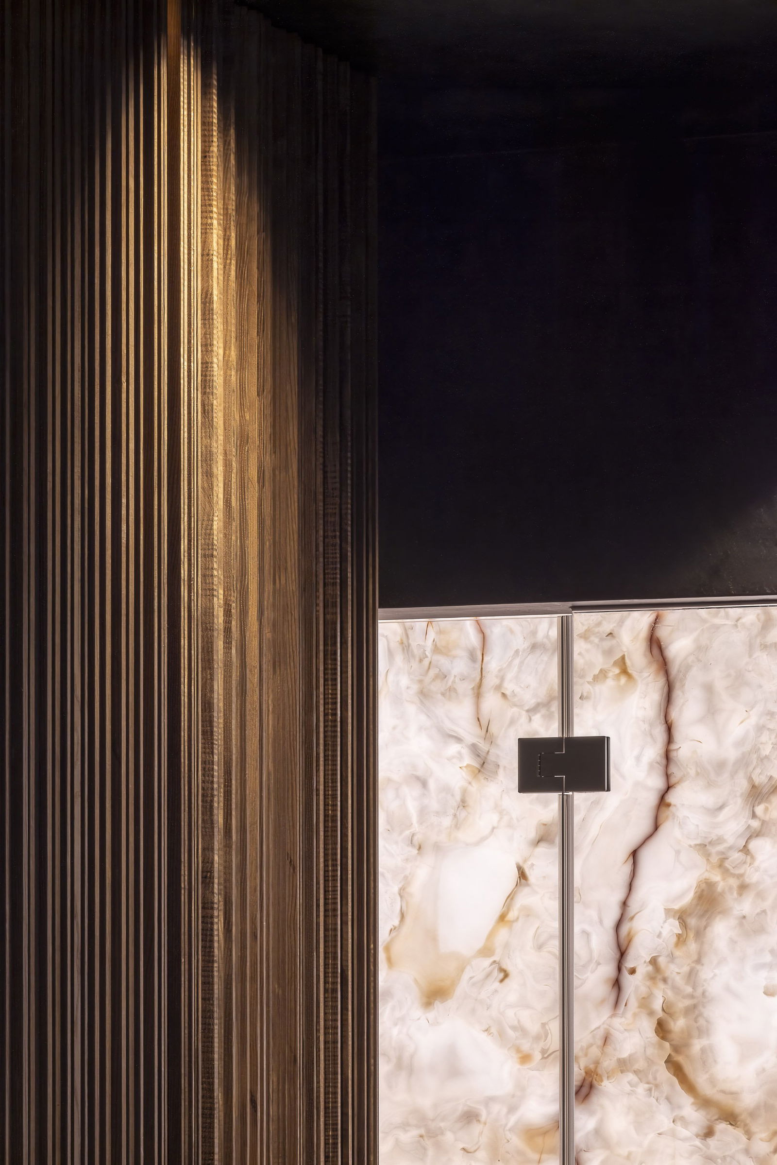 Une porte pivotante dissimulée fusionne le verre et le bois précieux en une surface architecturale unique et continue.